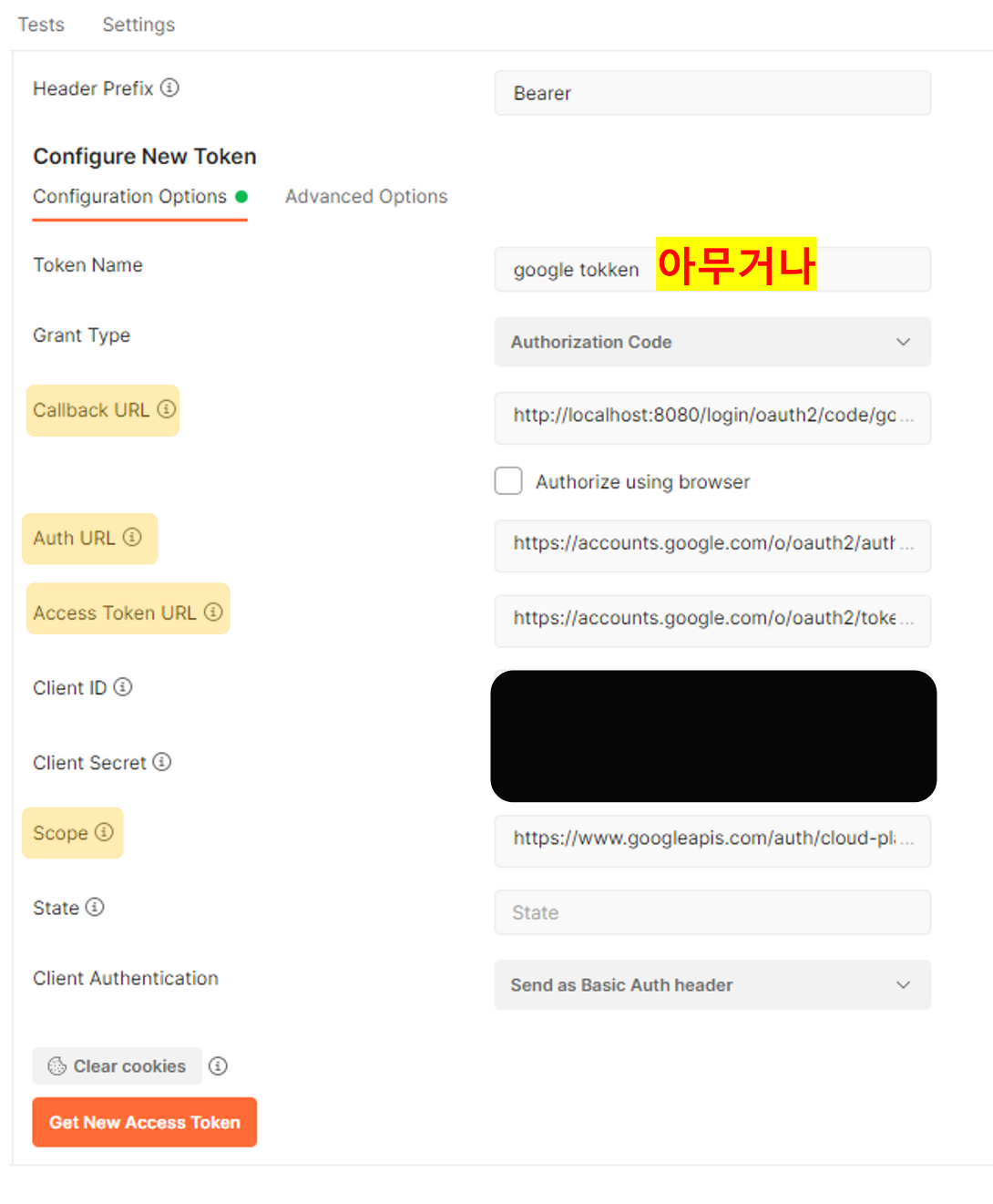 - Scope : 나는 https://www.googleapis.com/auth/cloud-platform 값을 넣음. 필수값이다